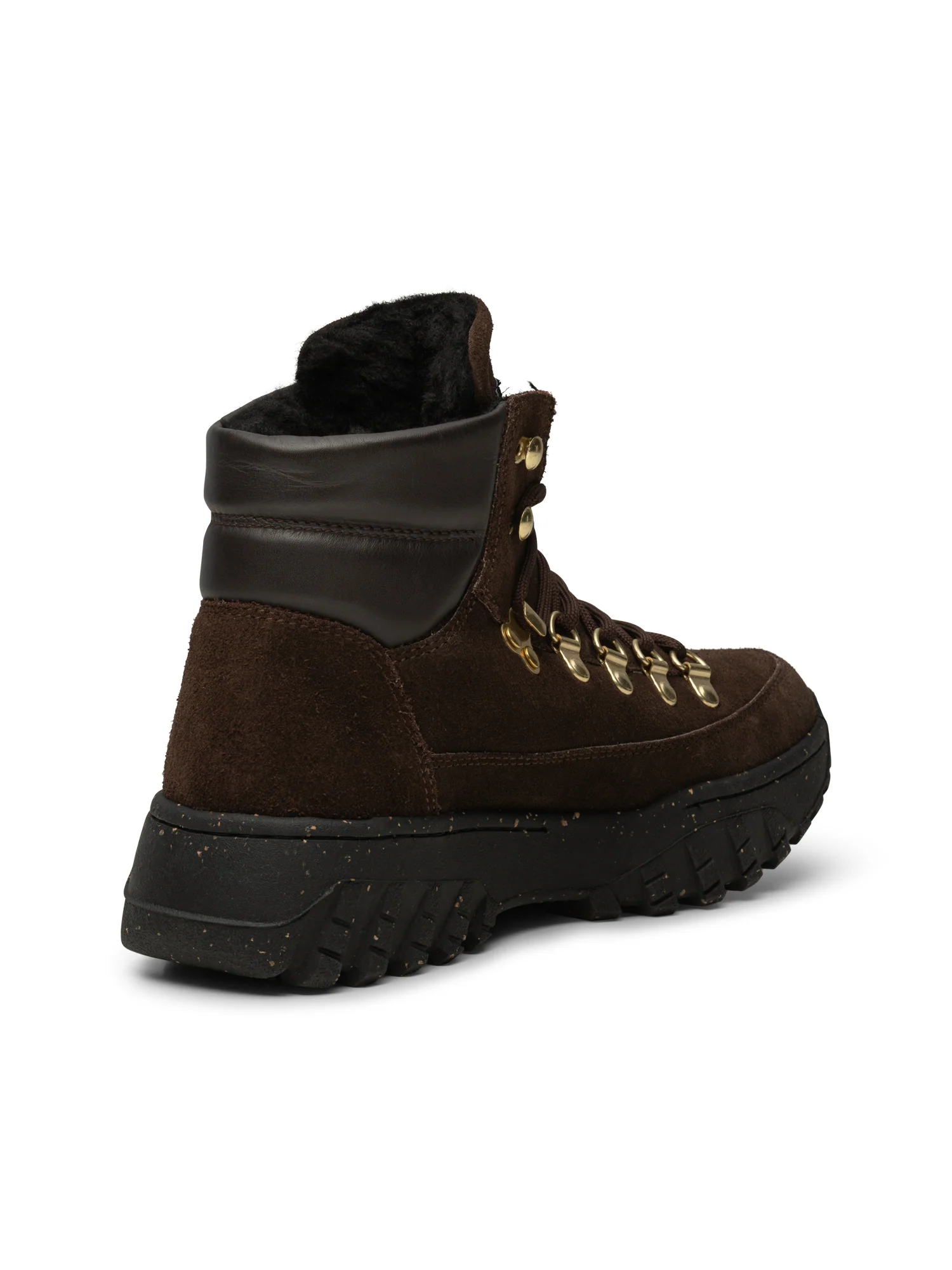 Iris Track ist ein praktischer Stiefel aus Wildleder mit natürlichem Wollfutter. An der Rückseite des Knöchels ist der Stiefel mit einzigartigen Details aus Fischleder verziert.