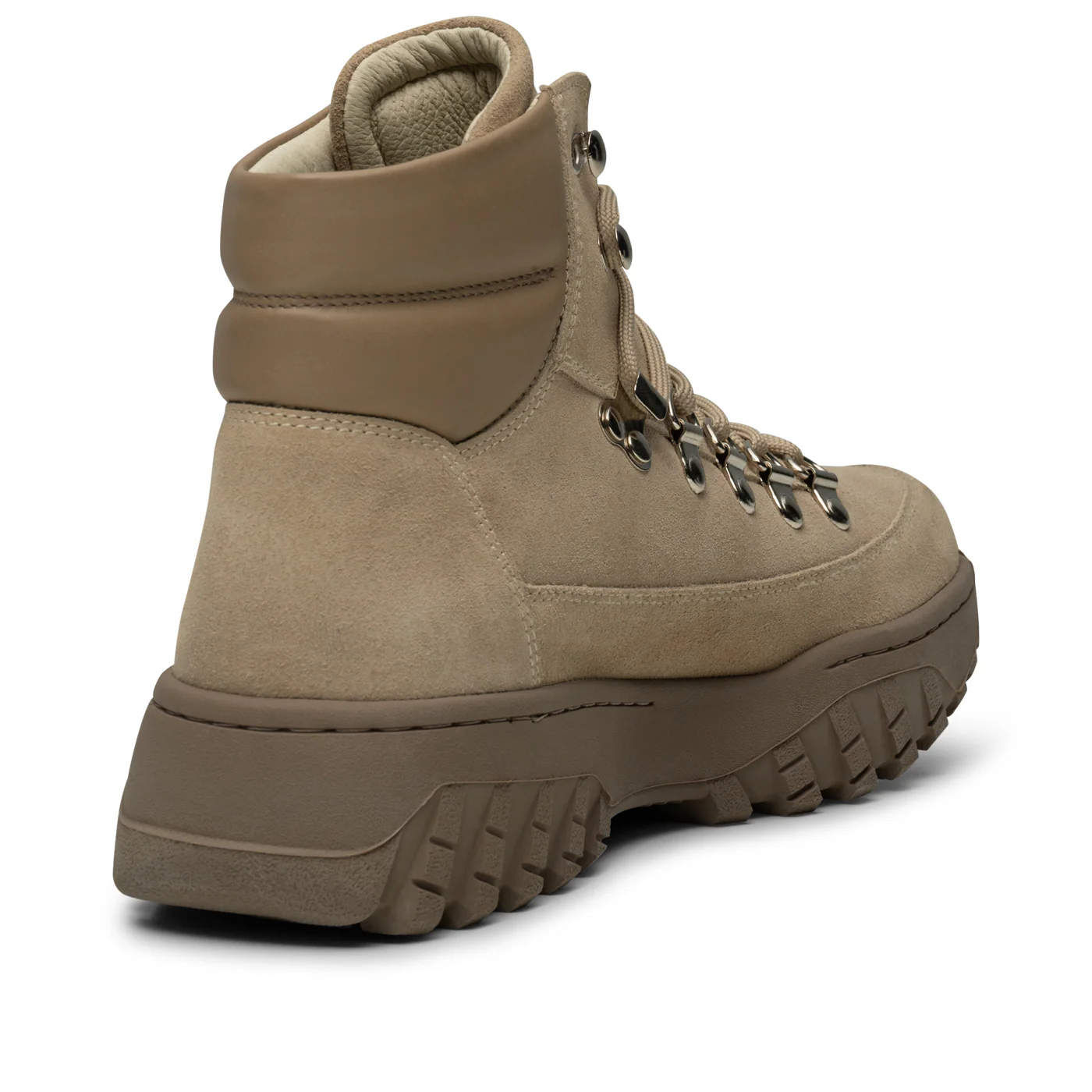 Iris Track ist ein praktischer Stiefel aus Wildleder mit natürlichem Wollfutter. An der Rückseite des Knöchels ist der Stiefel mit einzigartigen Details aus Fischleder verziert.