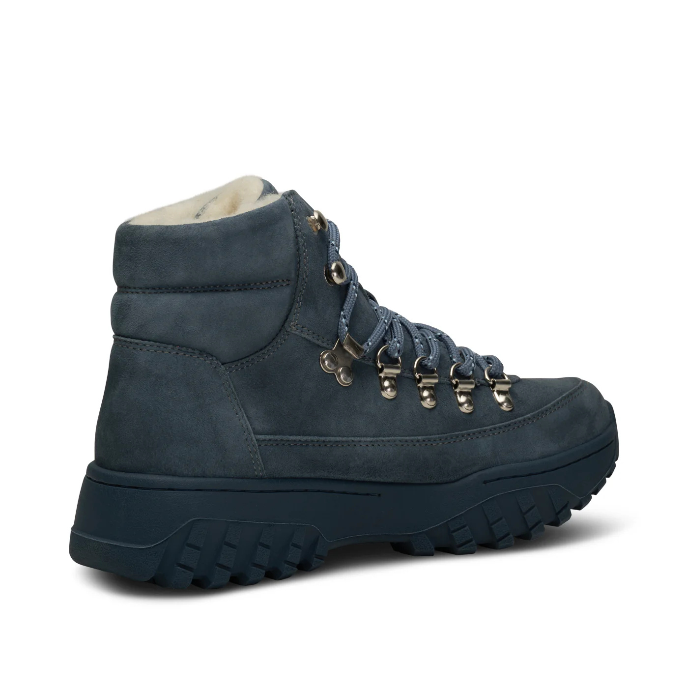 Iris Track ist ein praktischer Stiefel aus Wildleder mit natürlichem Wollfutter. An der Rückseite des Knöchels ist der Stiefel mit einzigartigen Details aus Fischleder verziert.