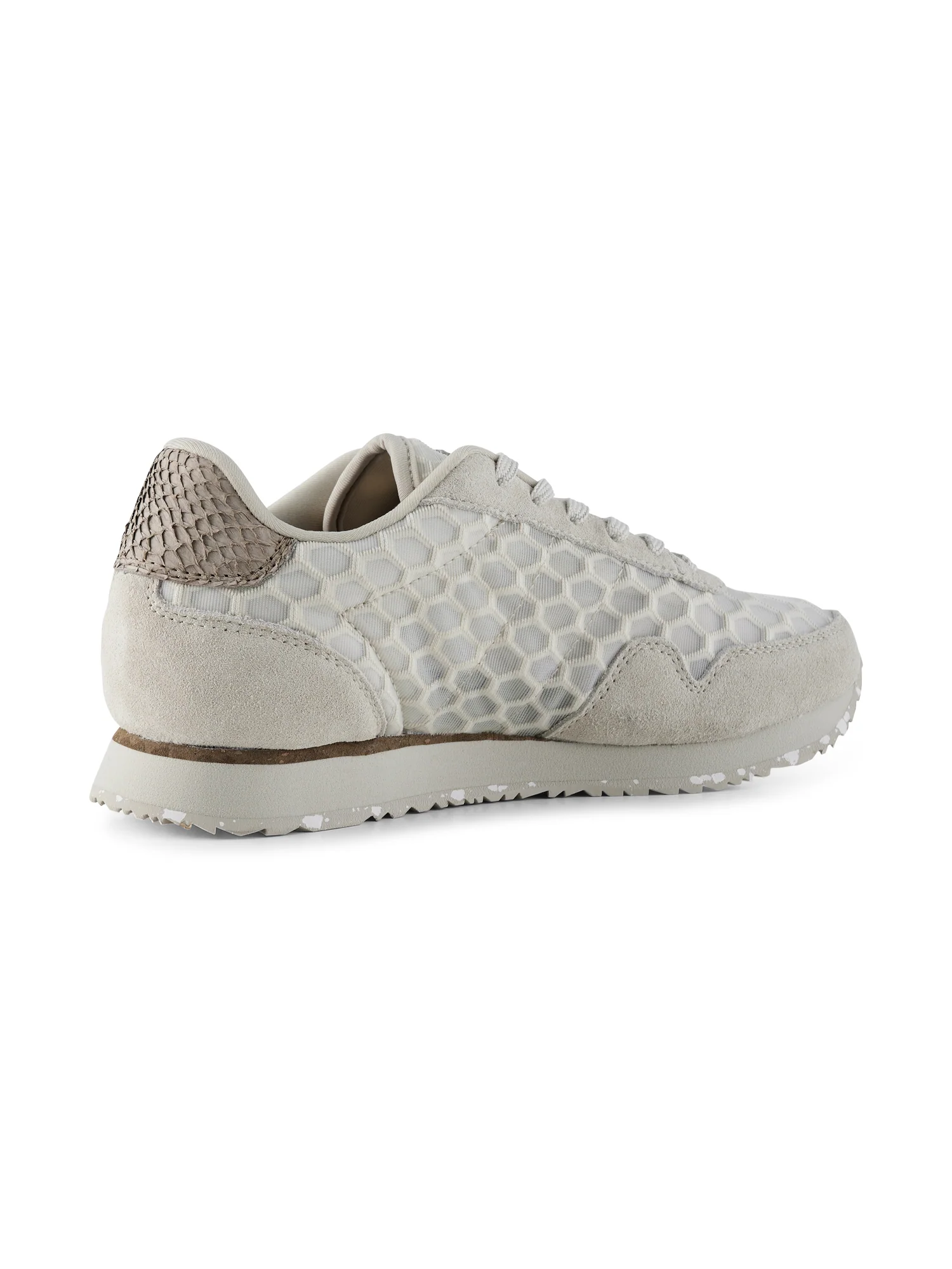 Ein eleganter Damen-Sneaker mit exklusiven Details. Das Obermaterial ist mit Details aus Fischleder, Kalbsleder und transparentem Mesh verziert. Dadurch ist der Schuh besonders leicht und bequem. Alle Sneaker sind mit FIFTY ausgestattet: einer Verstärkung an der Innenseite des Sneakers, die aus mindestens 50 % recyceltem Polyester besteht, das aus Plastikflaschen gewonnen wurde. Die herausnehmbare Einlegesohle aus natürlich stoßdämpfendem Kork mit ultraweichem Kern aus PU-Schaum sowie Lüftungslöchern sorgt für eine gute Belüftung im Schuh. Die Laufsohle besteht aus natürlichem Gummi, dem konventionelles Gummi und mindestens 10 % recyceltes Gummi beigemischt wurden. Ein strapazierfähiger Sneaker, der perfekt zum Urban Lifestyle passt.
