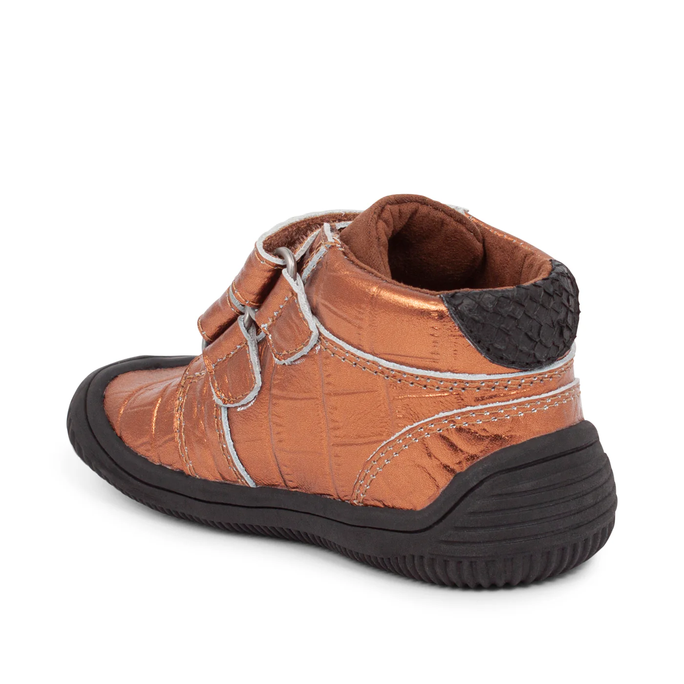 Pre-Walker aus glänzendem Kalbsleder mit Details aus Fischleder. Herausnehmbare Einlegesohle aus natürlich stoßdämpfendem Kork mit aufgezeichneter Wachstumszulage. Laufsohle aus TPR-Gummi.